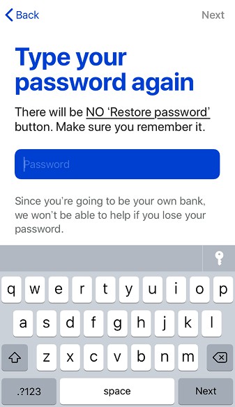 アプリを開き、最初の画面で「CREATE NEW WALLET」をタップすると、パスワード設定画面になります。