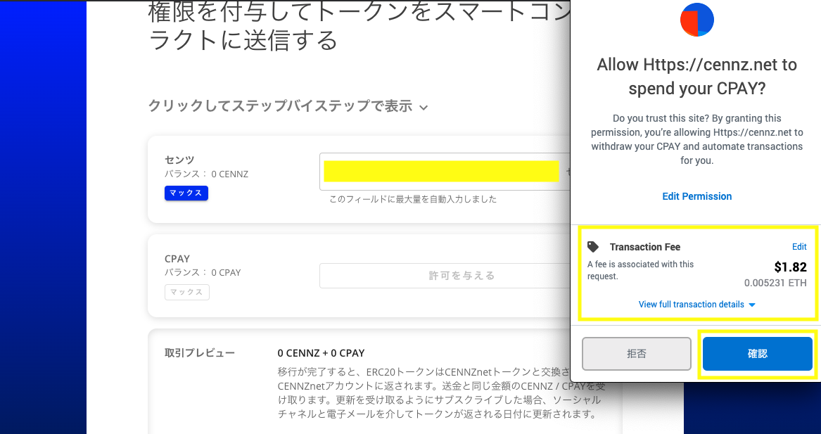 ⑨CPAYも同じように「許可を与える」をクリックし、ガス代の確認をします。