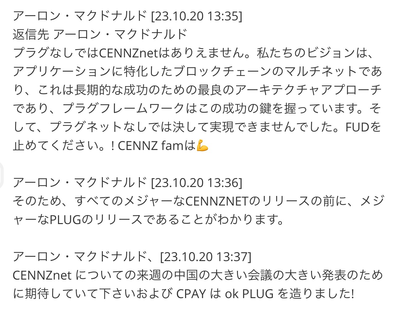意訳:プラグなしでCENNZネットワークの成立はあり得ません。私たちの野望は新時代のアプリ開発・相互利用であり、この成功の鍵を握っているのがプラグです。不安を煽りすぎることは避けてください。